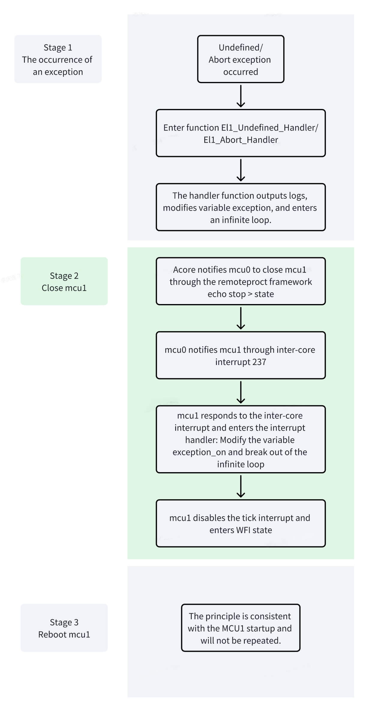 Specific principle: When an Undefined/Abort exception occurs, the system also ends up in an infinite loop. By using Acore’s sysfs interface to perform a software power-down of MCU1—i.e., notifying MCU1 to enter WFI mode—MCU1 will perform a software reboot upon the next start, thus achieving the intended recovery.