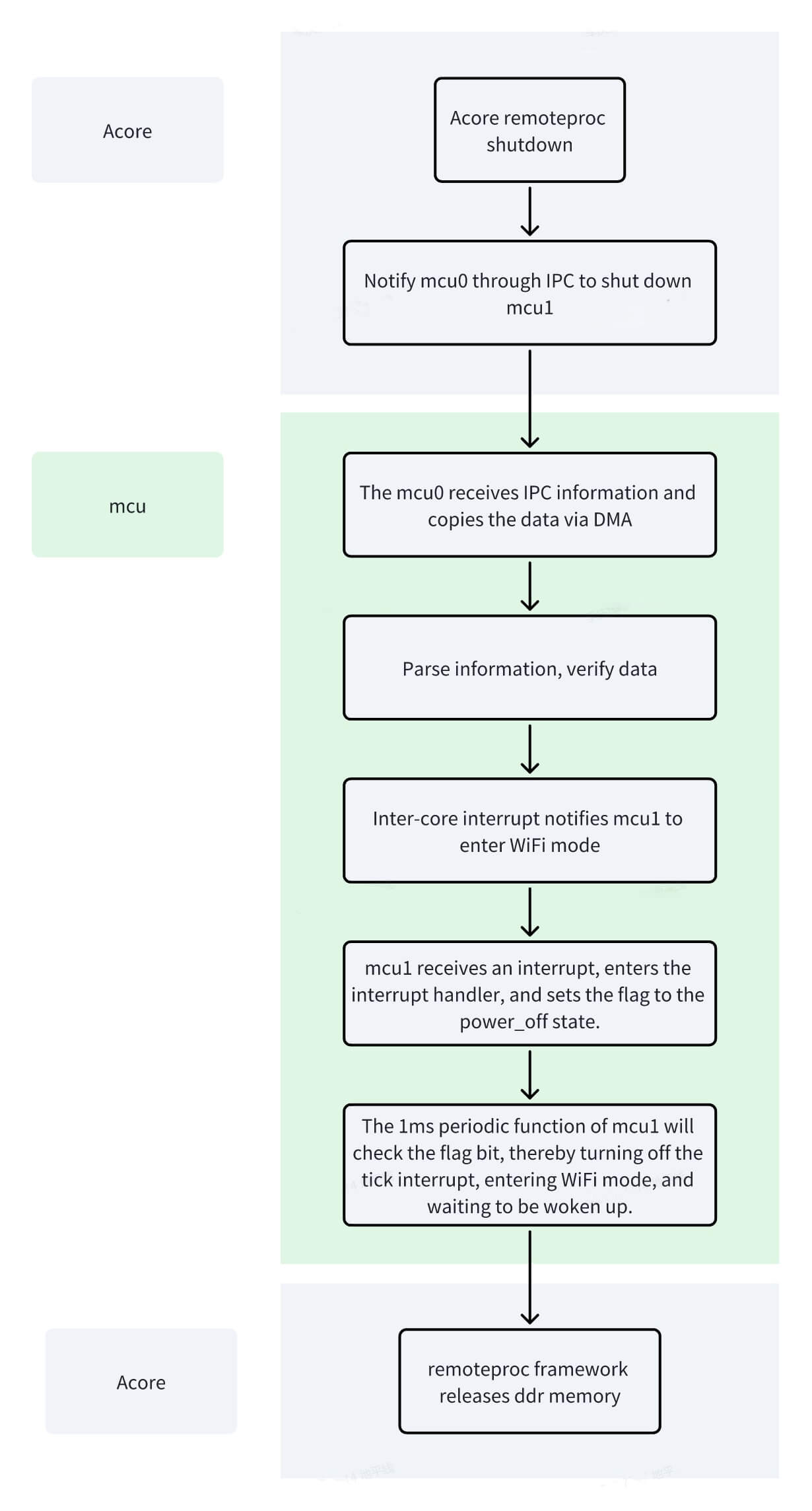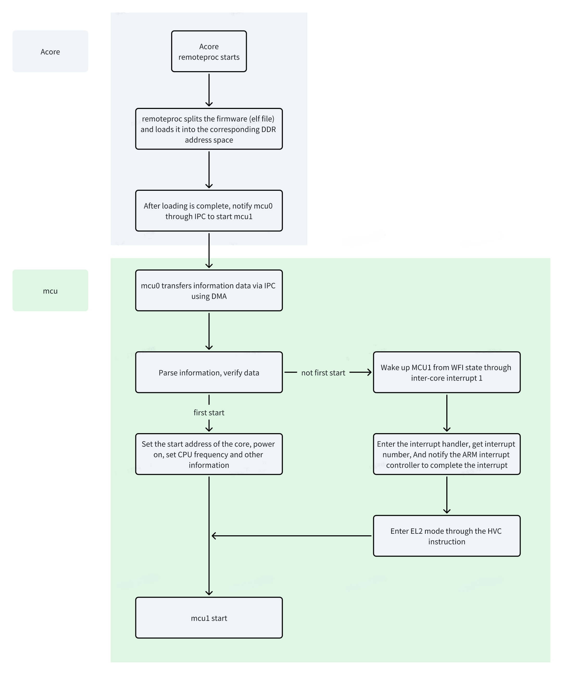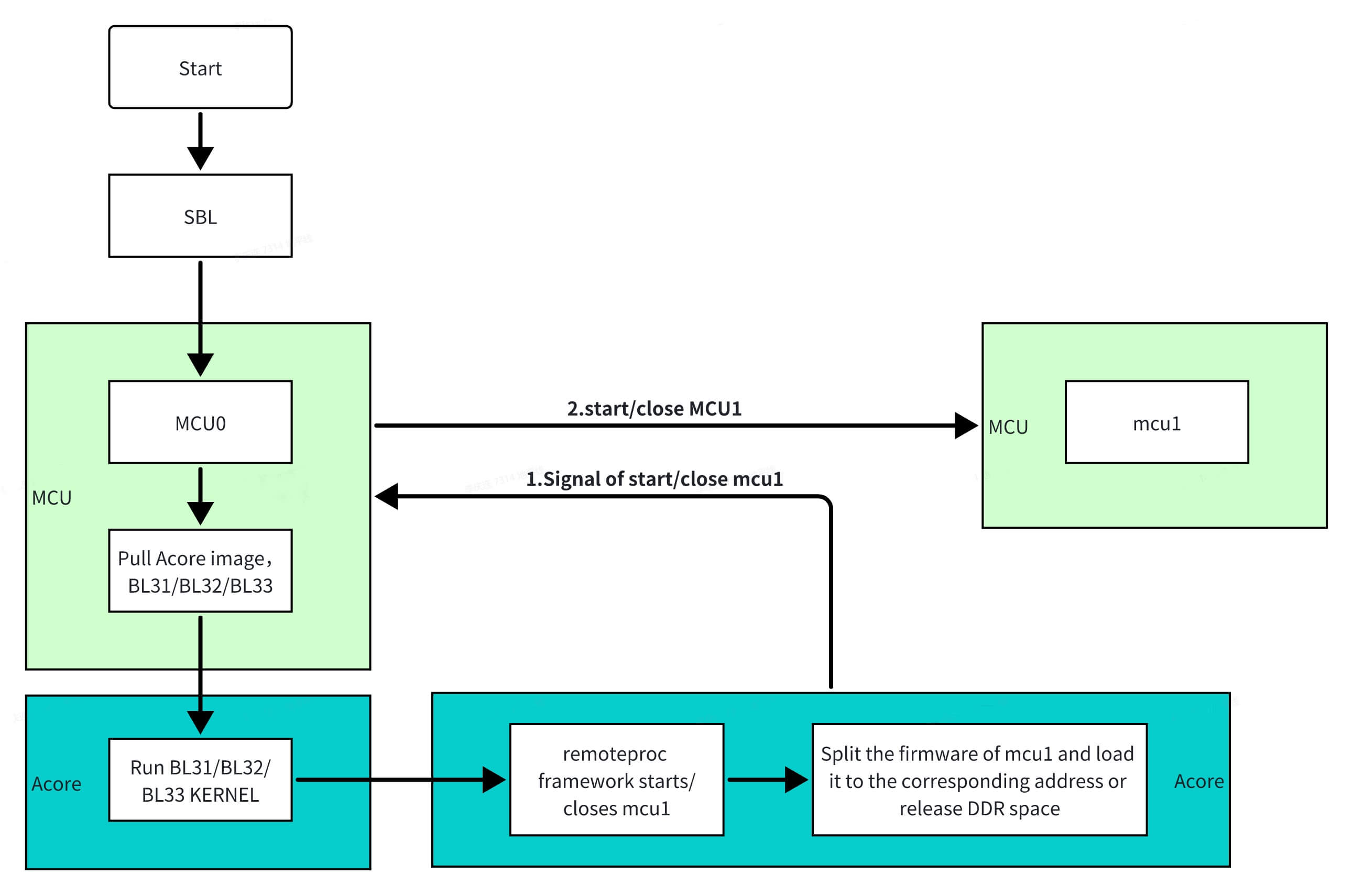 MCU1 startup and shutdown are controlled by the Acore through the remoteproc framework, which sends commands to MCU0 to manage MCU1.