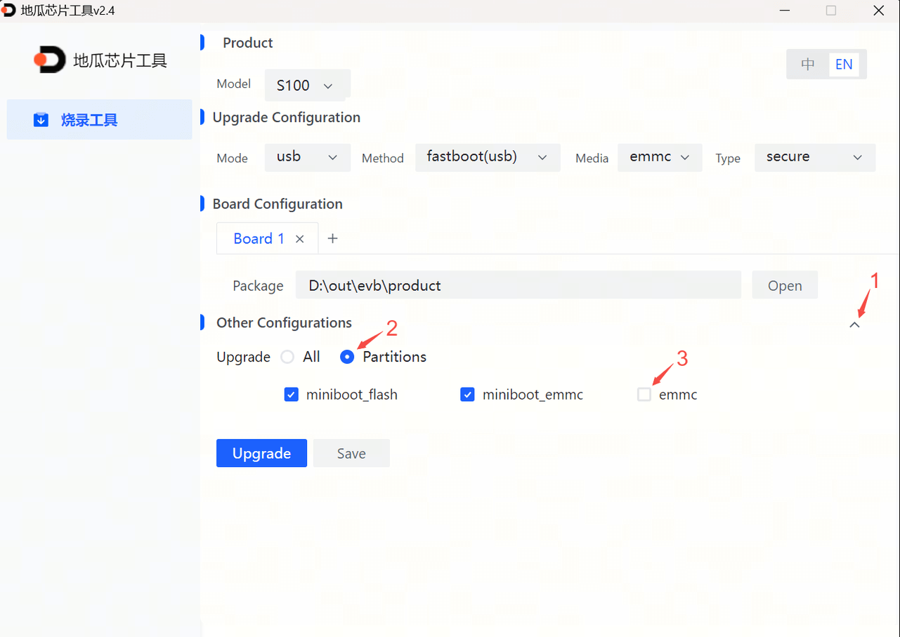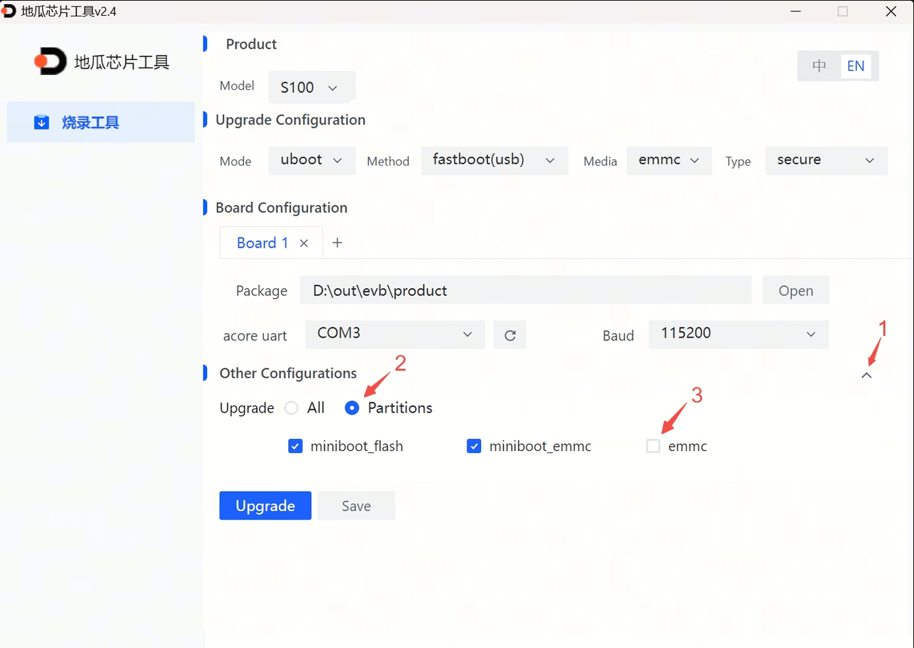 productfolder containing the firmware - Select the serial port connected to the RDK S100 (baud rate: 921600)