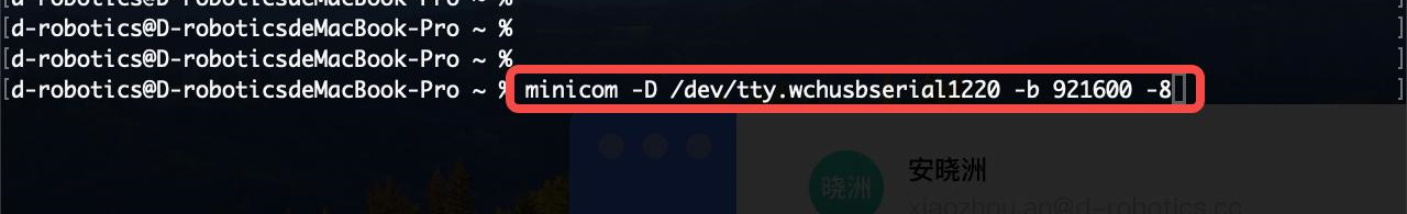 /dev/tty.wchusbserial1220是 ACore 串口,/dev/tty.wchusbserial1230是 MCU 串口,连接 ACore 串口命令是:minicom -D /dev/tty.wchusbserial1220 -b 921600 -8; 连接 MCU 串口命令是:minicom -D /dev/tty.wchusbserial1230 -b 921600 -8,请根据实际设备编号 /dev/tty.wchusbserial 替换命令中的设备路径 minicom连接 ACore 串口命令如下(minicom -D /dev/tty.wchusbserial1220 -b 921600 -8)