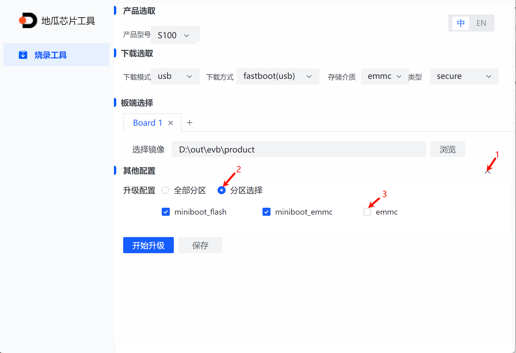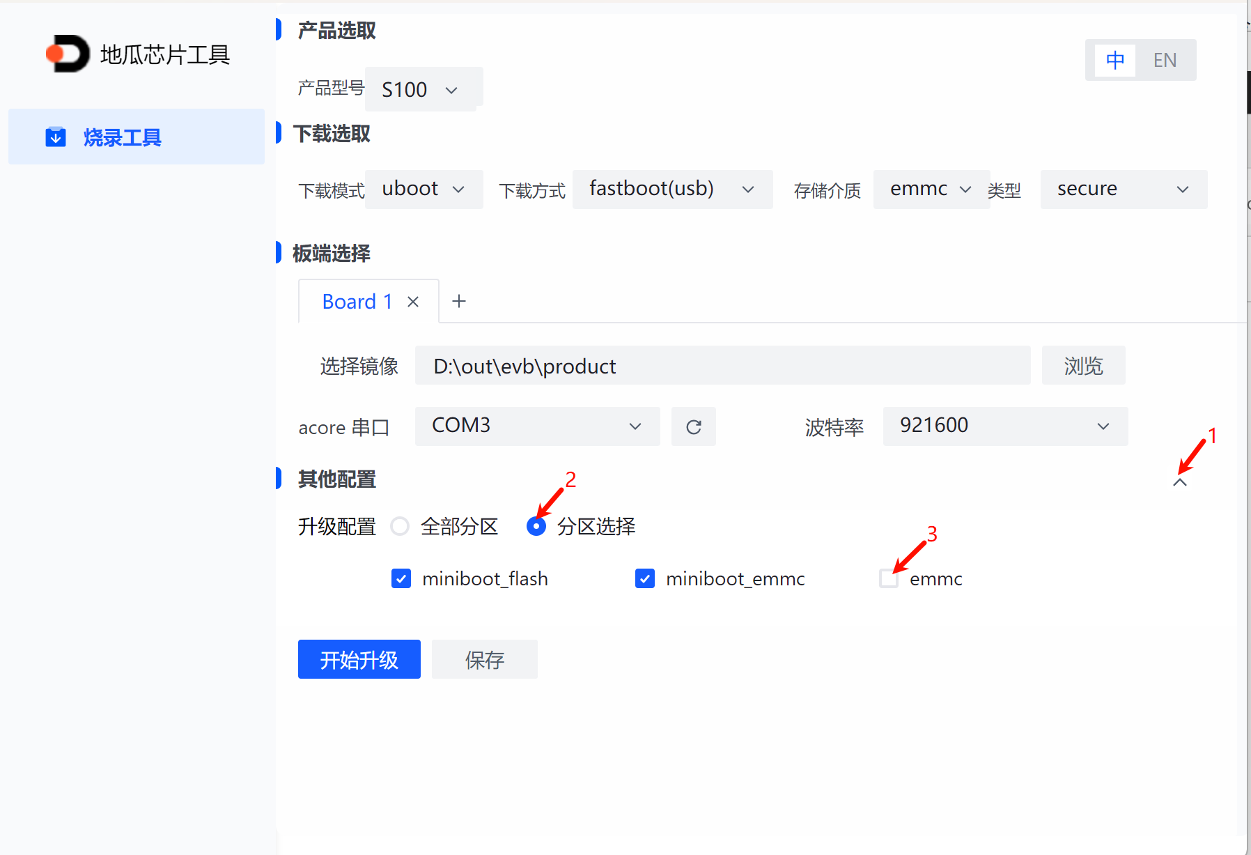 Miniboot 系统烧录整体流程与整机系统烧录一致,需要额外配置: